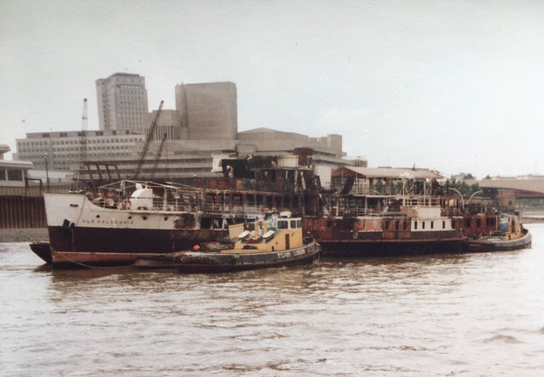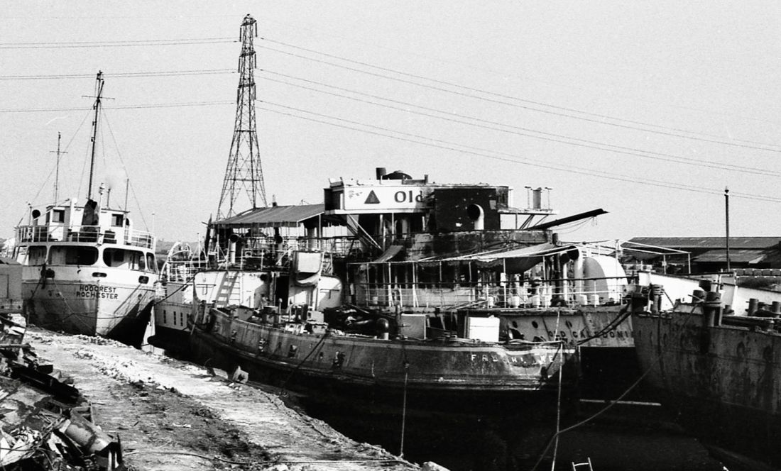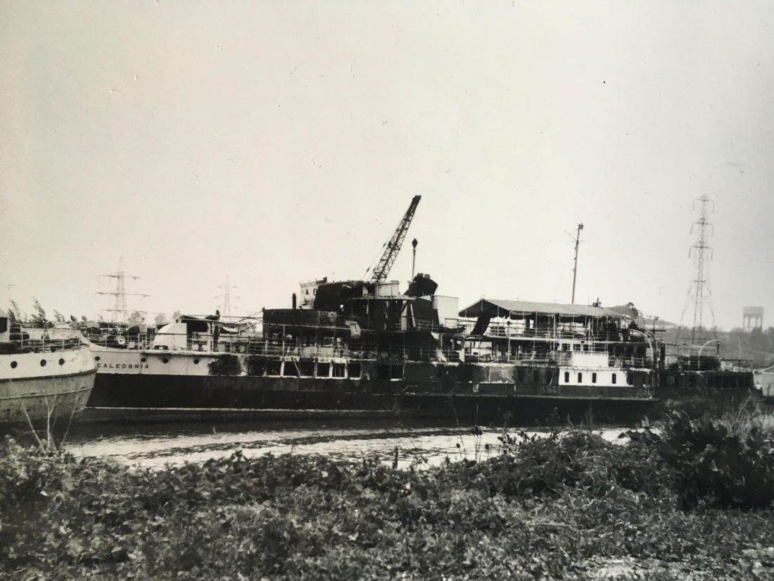 Above : After the fire, Old Caledonia was towed for scrapping at Sittingbourne. Photo by kind courtesy of Robert McLuckie