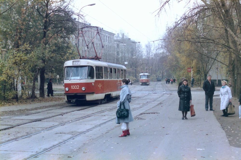 | Above : View northwards on Tikhvinskaya Ulitsa at the junction with Minayevskiy Pereulok. The tram has come the short distance from the nearby Ulitsa Dvintsev terminus on tracks which are now closed. Tracks remain in Tikhvinskaya Ulitsa south of here and in Minayevskiy Pereulok. The ground floor of the block of flats has been turned over to shops. A new block towers over the smaller building in the distance | ||||||